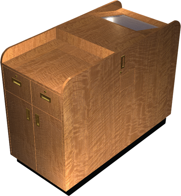 Our pit podiums are custom-built to accommodate any type of equipment such as computers, monitors, printers or trash receptacles and can provide for storage of files and extra supplies.